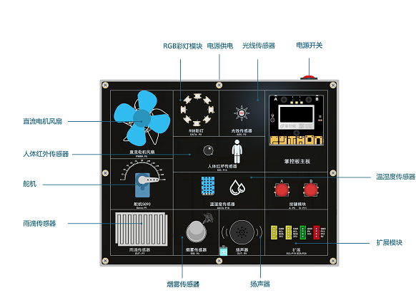 1、包含人體紅外傳感器、光線傳感器、溫濕度傳感器、RGB彩燈、直流電機風扇、舵機、雨滴傳感器、揚聲器、擴展模塊等。