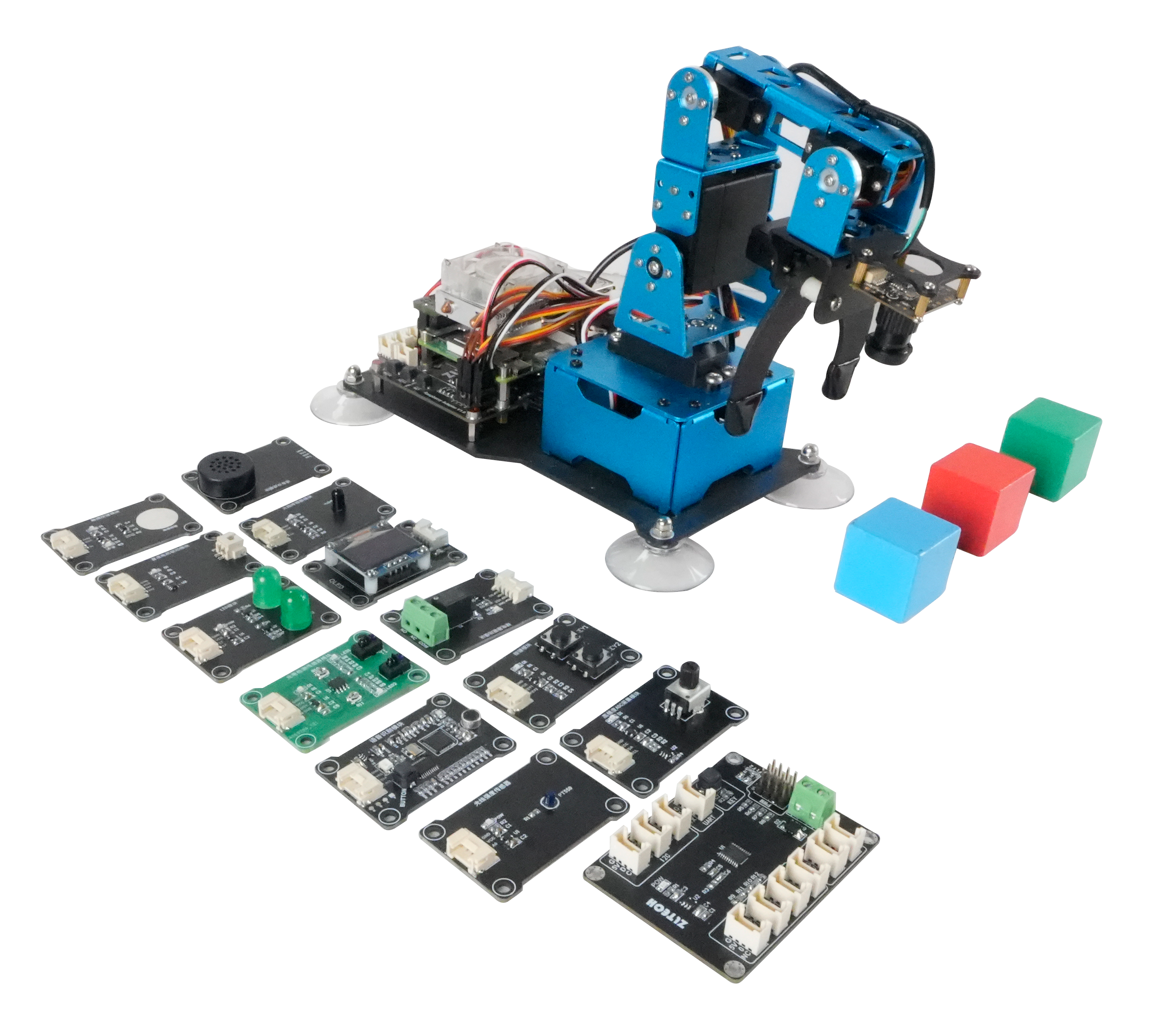 通過構(gòu)建場景與(3)-(7)中AI視覺、AI語音、機(jī)器人運(yùn)動學(xué)、ROS激光雷達(dá)、全系列傳感模塊等相結(jié)構(gòu),實(shí)現(xiàn)場景、多傳感器器綜合實(shí)驗(yàn)。例如,a)顏色分揀:通過對目標(biāo)色塊進(jìn)行顏色識別和坐標(biāo)定位,可以輕松控制機(jī)械臂實(shí)現(xiàn)顏色識別、抓取、分揀。b)智能碼垛:通過對目標(biāo)物品進(jìn)行識別和定位,可以輕松實(shí)現(xiàn)色塊碼垛的功能。c)目標(biāo)追蹤:通過對目標(biāo)色塊進(jìn)行視覺定位,利用機(jī)械臂的逆運(yùn)動學(xué)算法,可以更好的對目標(biāo)色塊進(jìn)行捕捉和追蹤。