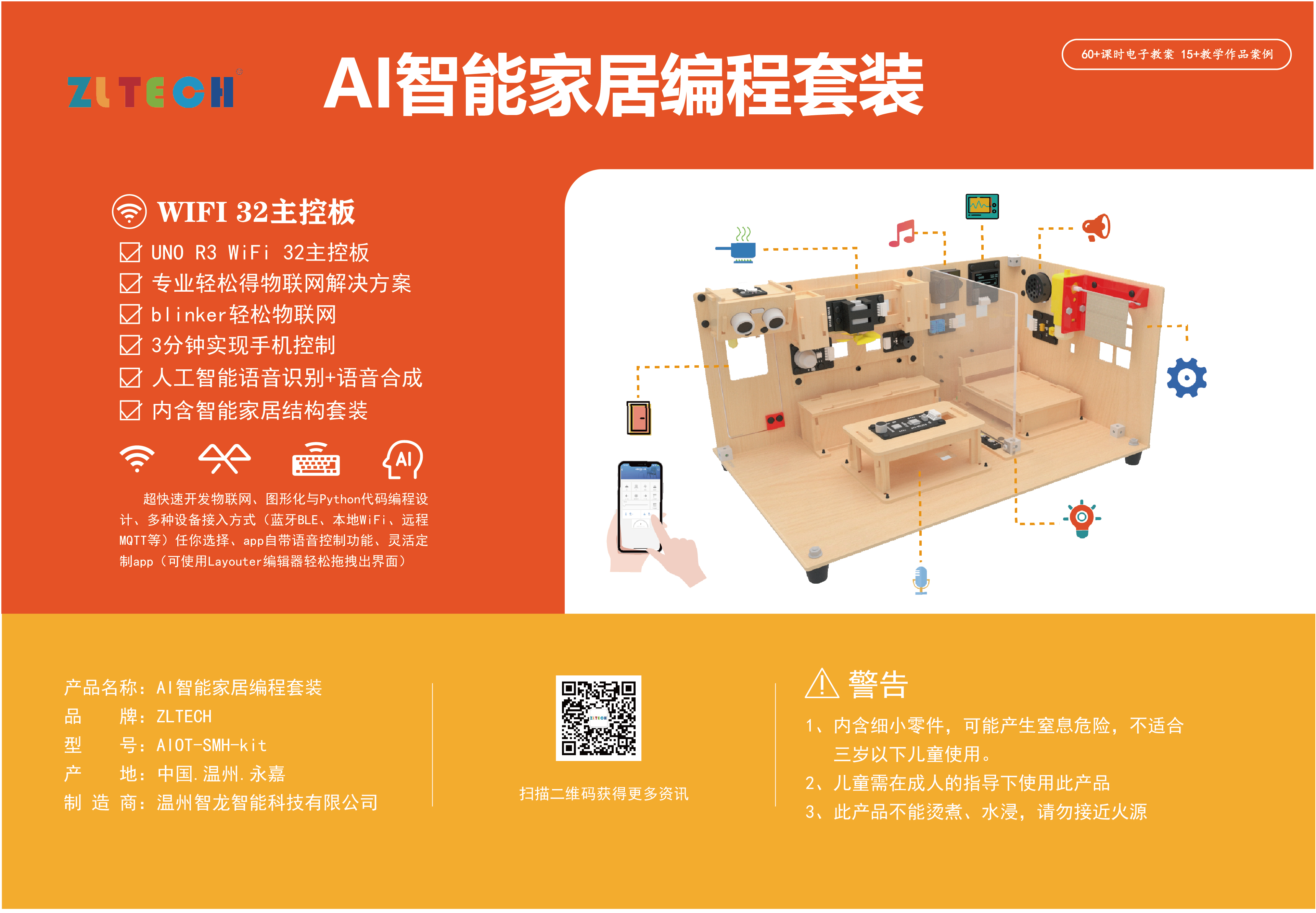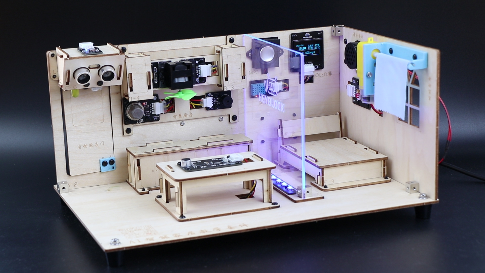 2、AI智能家居教學(xué)套件可根據(jù)圖形化編程可實(shí)現(xiàn)相應(yīng)的功能:第一,自動(dòng)燈光與自動(dòng)感應(yīng)門功能,利用光敏傳感器與LED實(shí)現(xiàn)自動(dòng)燈光,利用超聲波傳感器與舵機(jī)實(shí)現(xiàn)自動(dòng)感應(yīng)門功能;第二,智慧廚房功能,當(dāng)煙霧傳感器檢測(cè)煙霧達(dá)到一定數(shù)值時(shí),廚房排風(fēng)風(fēng)扇電機(jī)會(huì)自動(dòng)打開,當(dāng)煙霧濃度達(dá)到較高時(shí),蜂鳴器警報(bào)會(huì)想起,且同時(shí)自動(dòng)打開排風(fēng)風(fēng)扇;第三,AI智能家居還能將溫濕度傳感器檢測(cè)的溫度與濕度實(shí)時(shí)顯示在1.3寸的OLED屏幕中,且OLED還同時(shí)顯示當(dāng)前日期、時(shí)間與MP3當(dāng)前播放的MP3歌曲序號(hào);第四,AI智能家居還能根據(jù)AI語音識(shí)別模塊與語音合成模塊進(jìn)行人工智能語音交互自動(dòng)開燈、開門、選擇燈光模式、門禁模式、打開關(guān)閉炫彩燈、自動(dòng)控制窗簾、自動(dòng)播放MP3音樂、自動(dòng)切歌、調(diào)節(jié)音量等;第五,AI智能家居還可利用手機(jī)APP進(jìn)行遠(yuǎn)程交互控制,包括在手機(jī)APP查看當(dāng)前室內(nèi)溫度、濕度、廚房煙霧濃度等參數(shù),并利用手機(jī)APP對(duì)智能家居進(jìn)行相應(yīng)的功能控制,包括開關(guān)門、開關(guān)燈、炫彩燈開關(guān)、廚房排風(fēng)開關(guān)、音樂播放、調(diào)節(jié)音量、切歌、控制窗簾等功能;